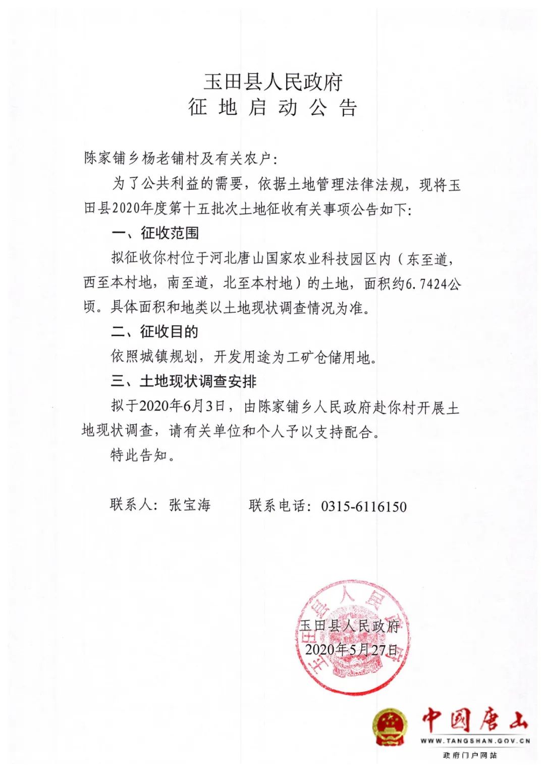 征收范围:位于河北唐山国家农业科技园区内(东至杨老铺村地,西至王明铺村地,南至道,北至杨老铺村地)的土地。