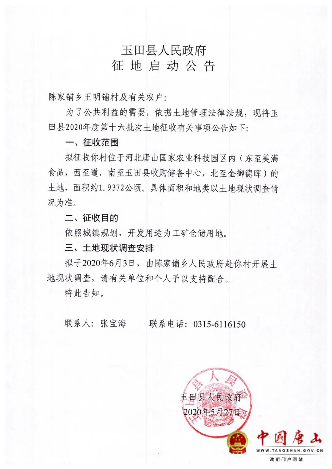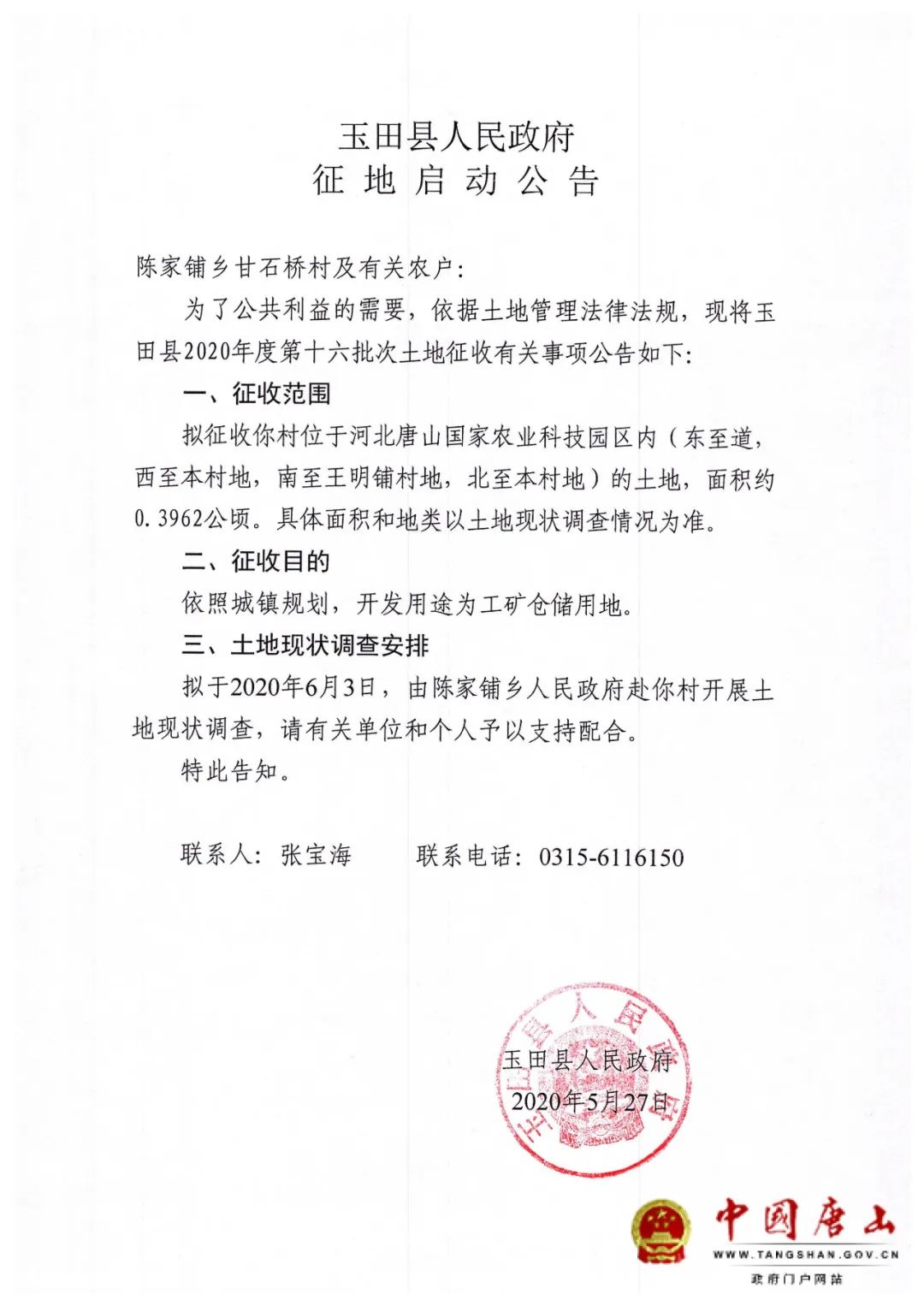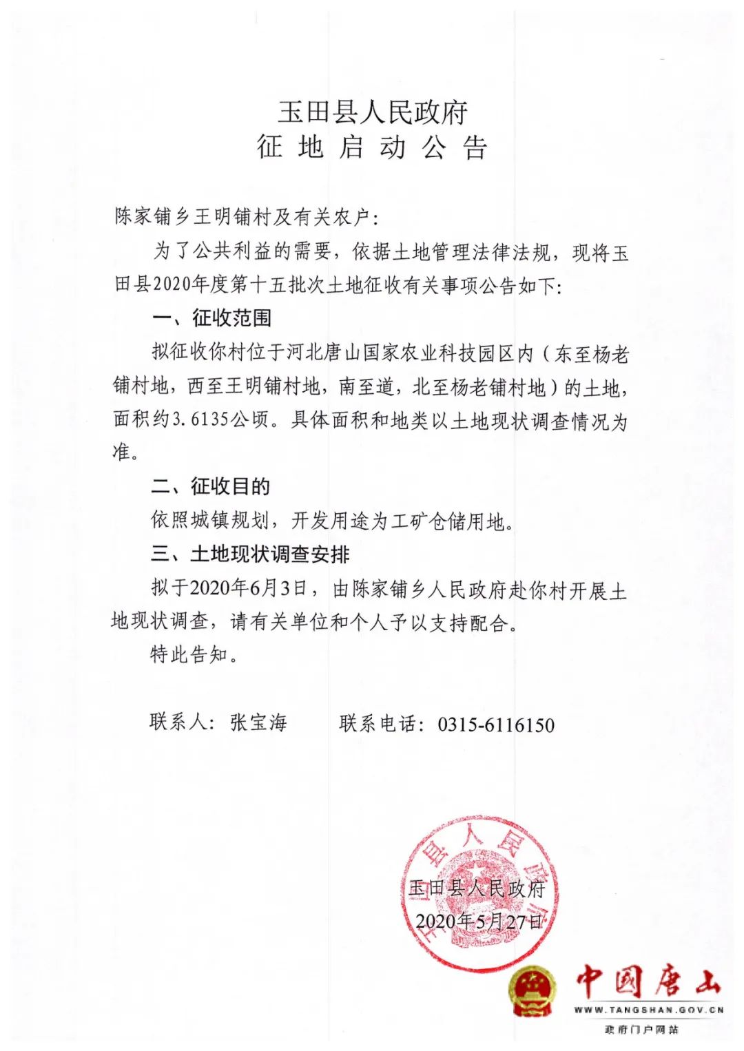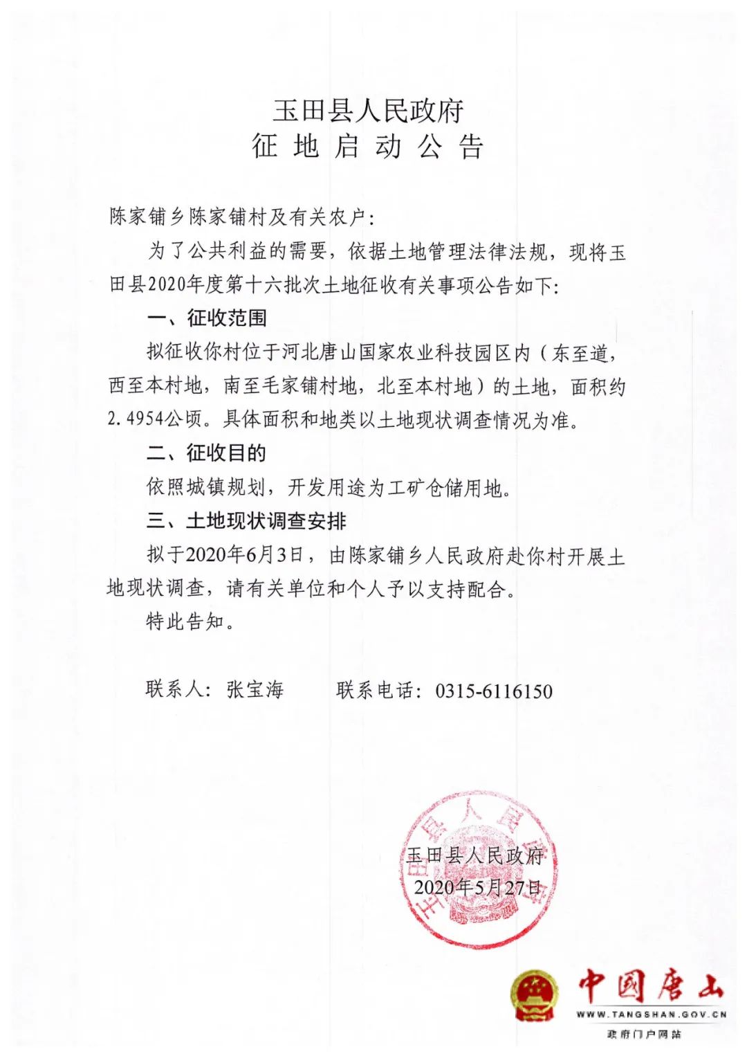征收范围:位于河北唐山国家农业科技园区内(东至道,西至本村地,南至本村地,北至陈家铺村地)的土地。