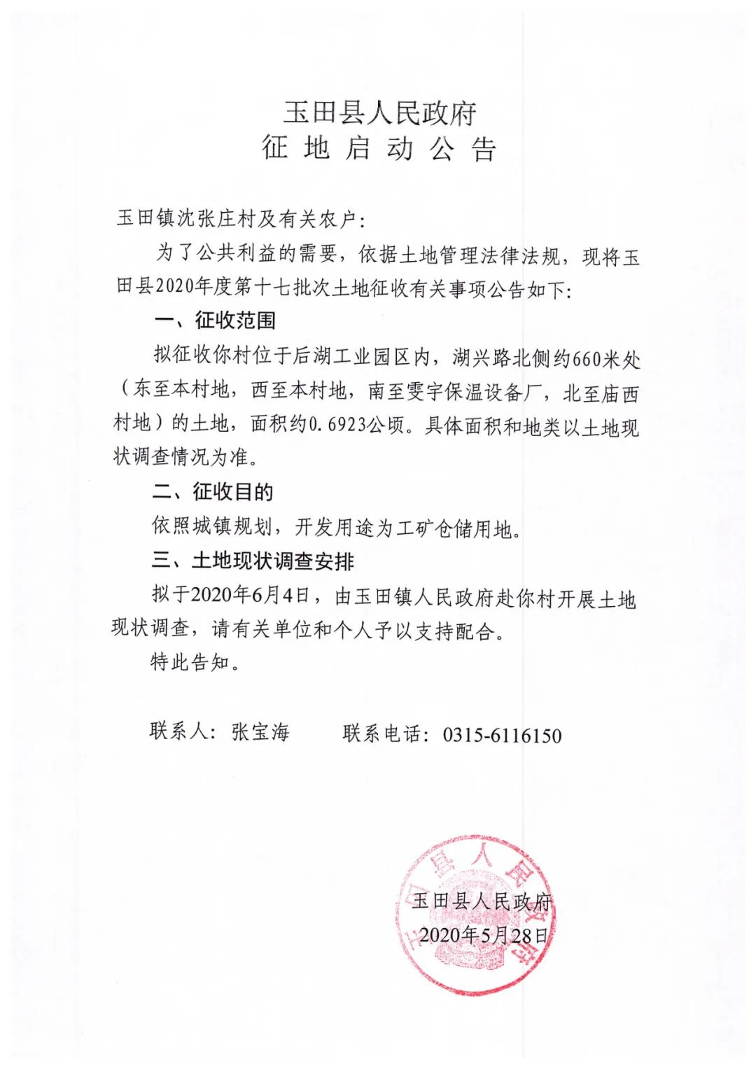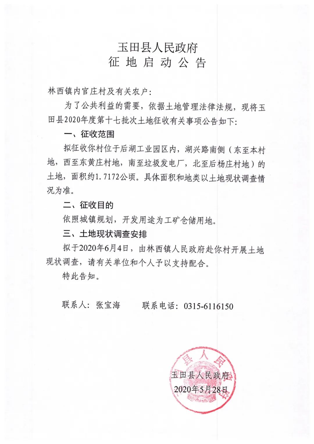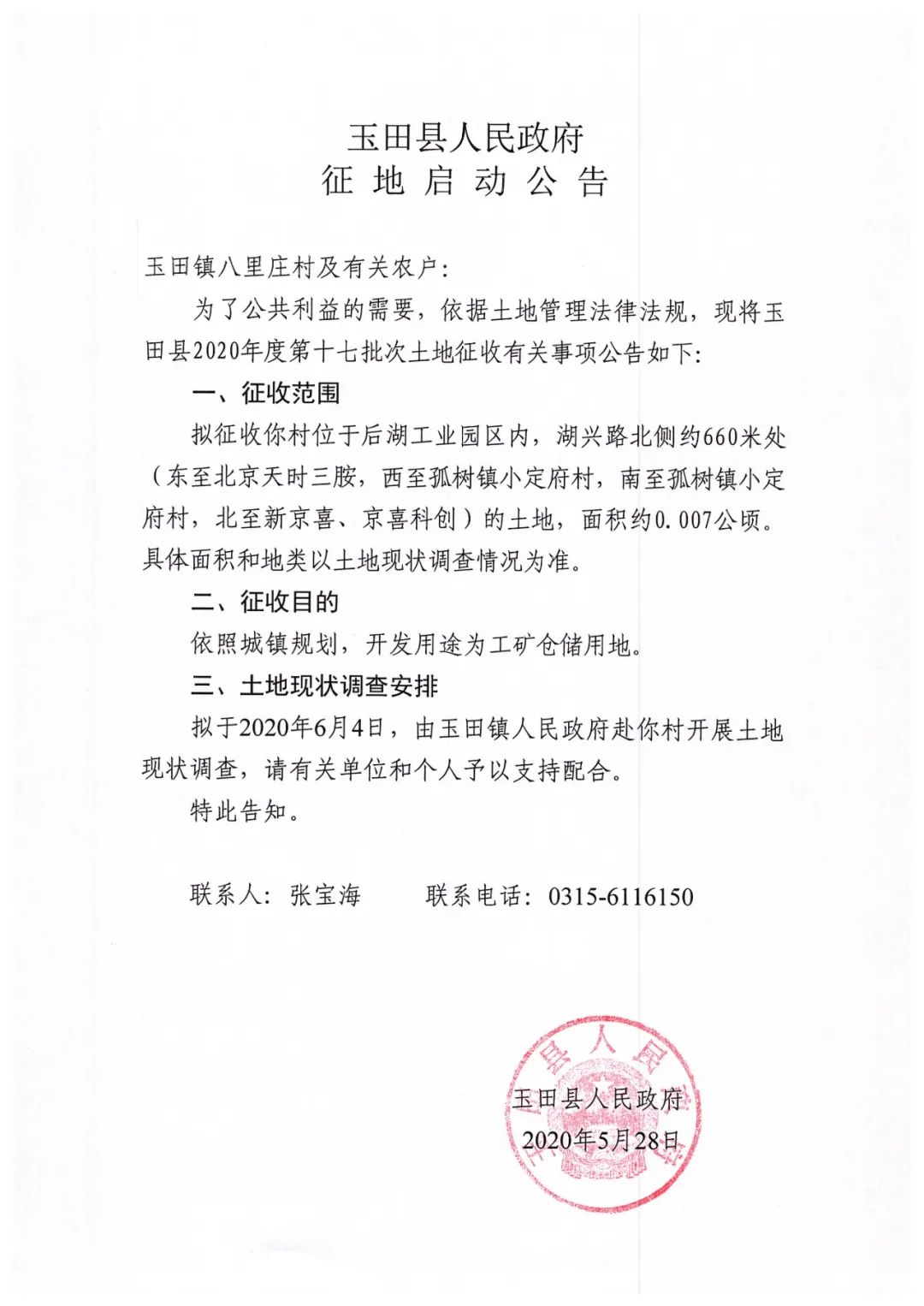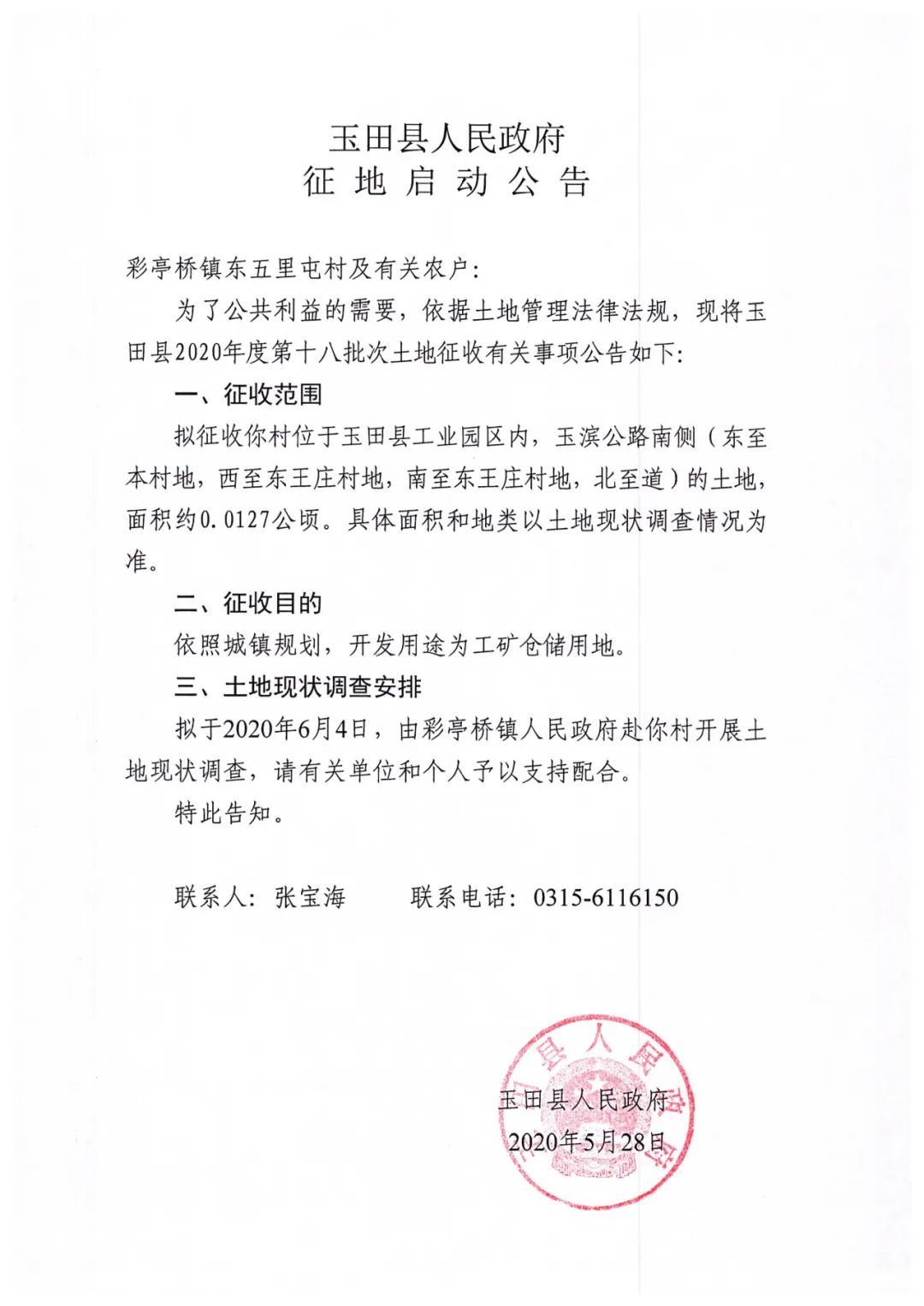 征收范围:位于玉田县工业园区内,玉滨公路南侧(东至本村地,东五里屯村地,西至唐山瑞濠天然气有限公司,南至本村地,北至玉滨公路)的土地。