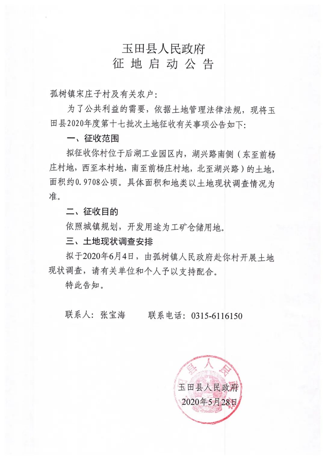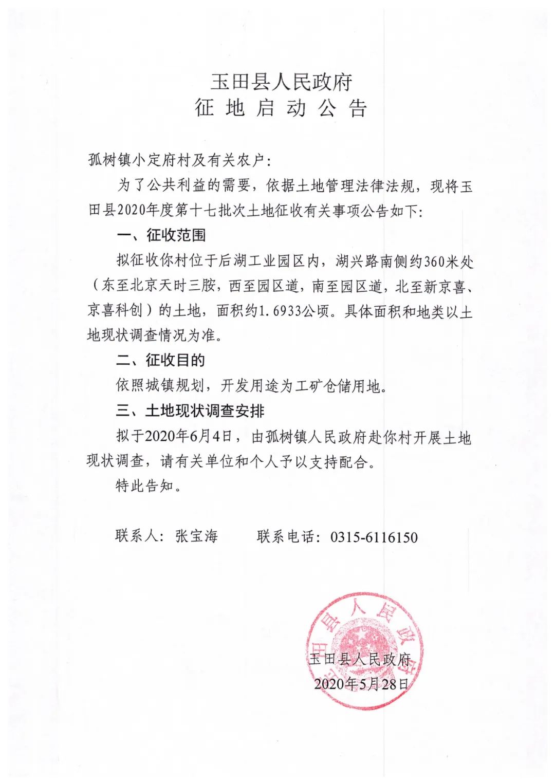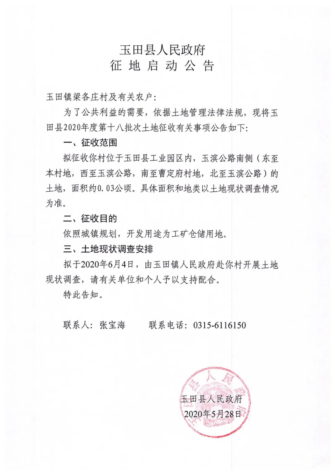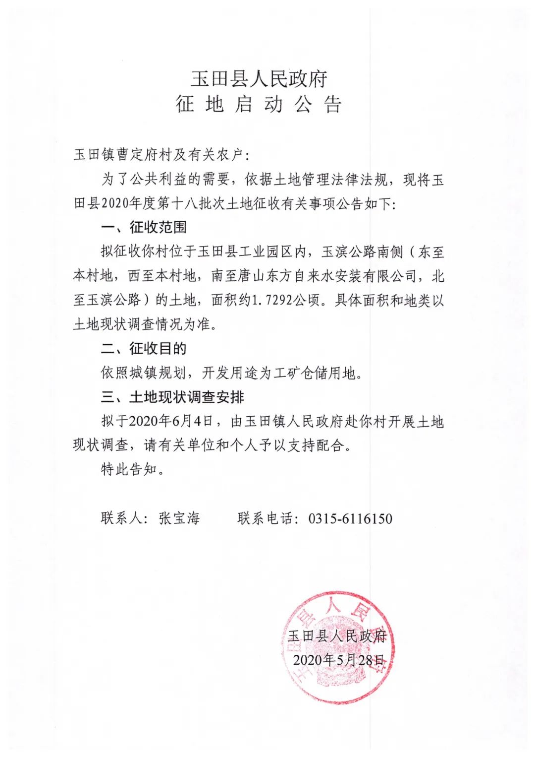 征收范围:位于玉田县工业园区内,玉滨公路南侧(东至本村地,西至玉滨公路,南至曹定府村地,北至玉滨公路)的土地。