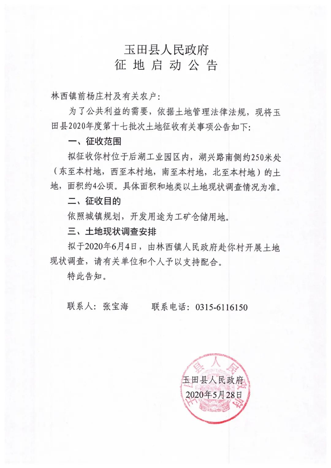 征收范围:位于玉田县工业园区内,伯雍大街北侧约130米处(东至道,西至本村地,南至玉田县殡仪馆,北至本村地)的土地。