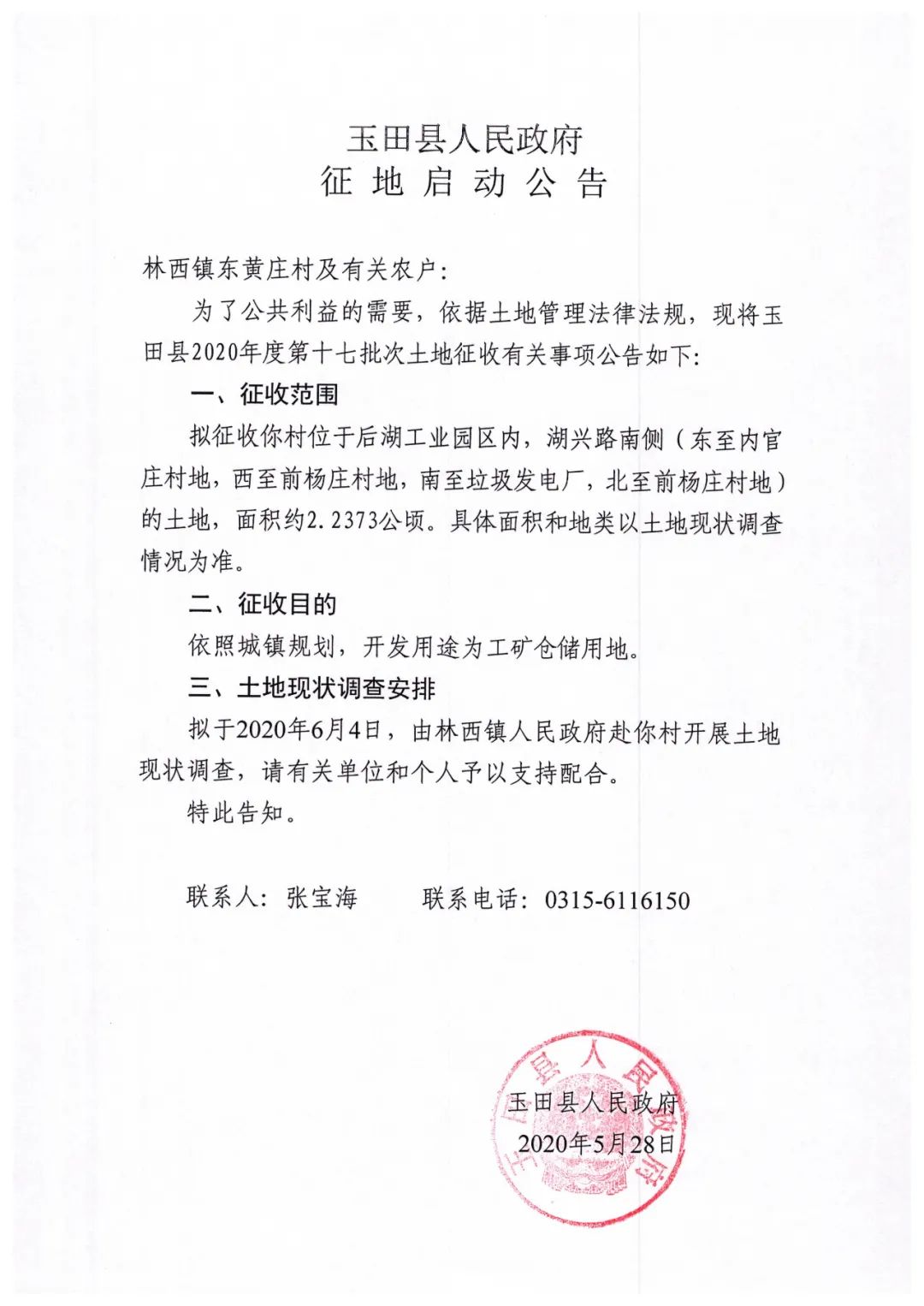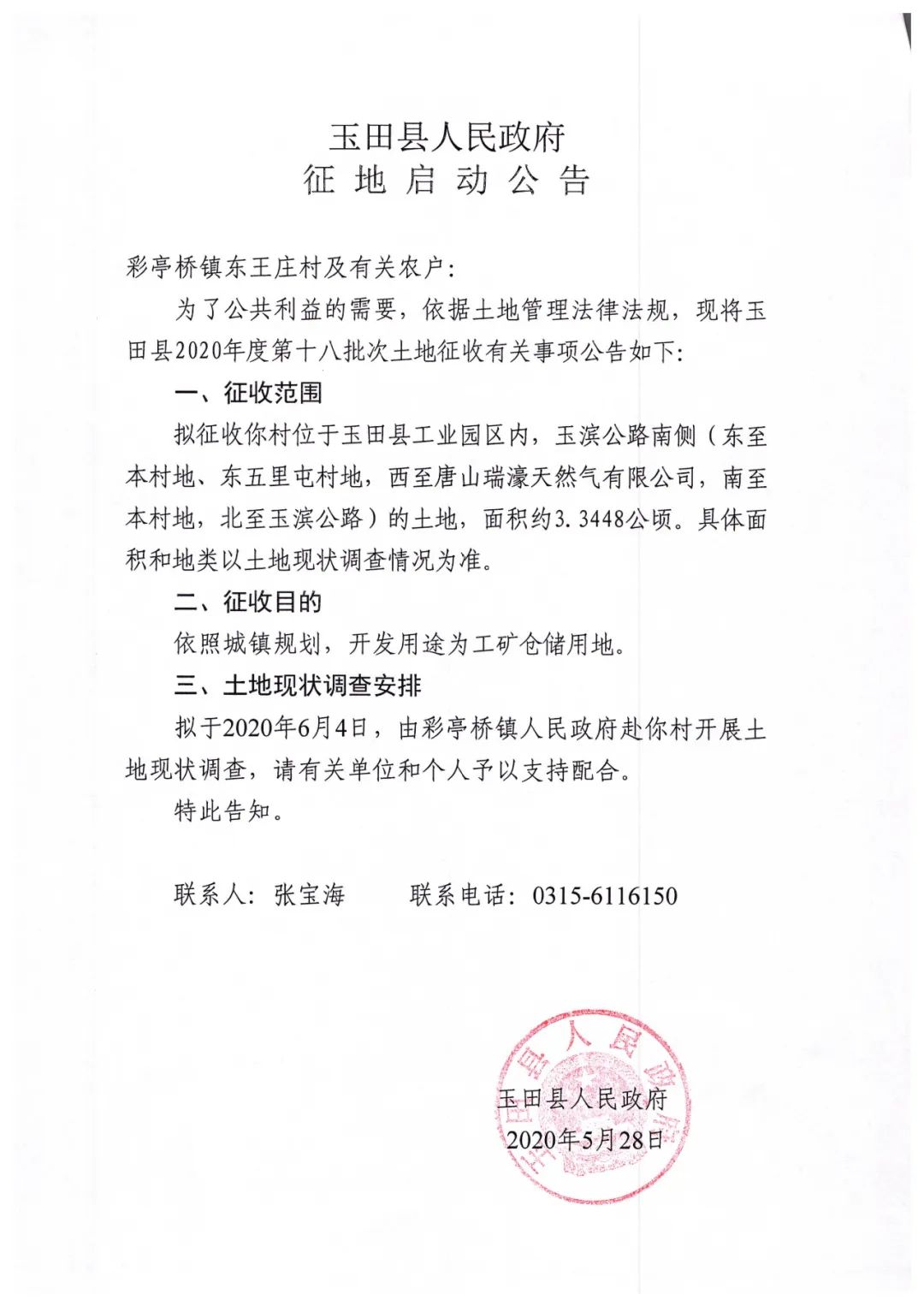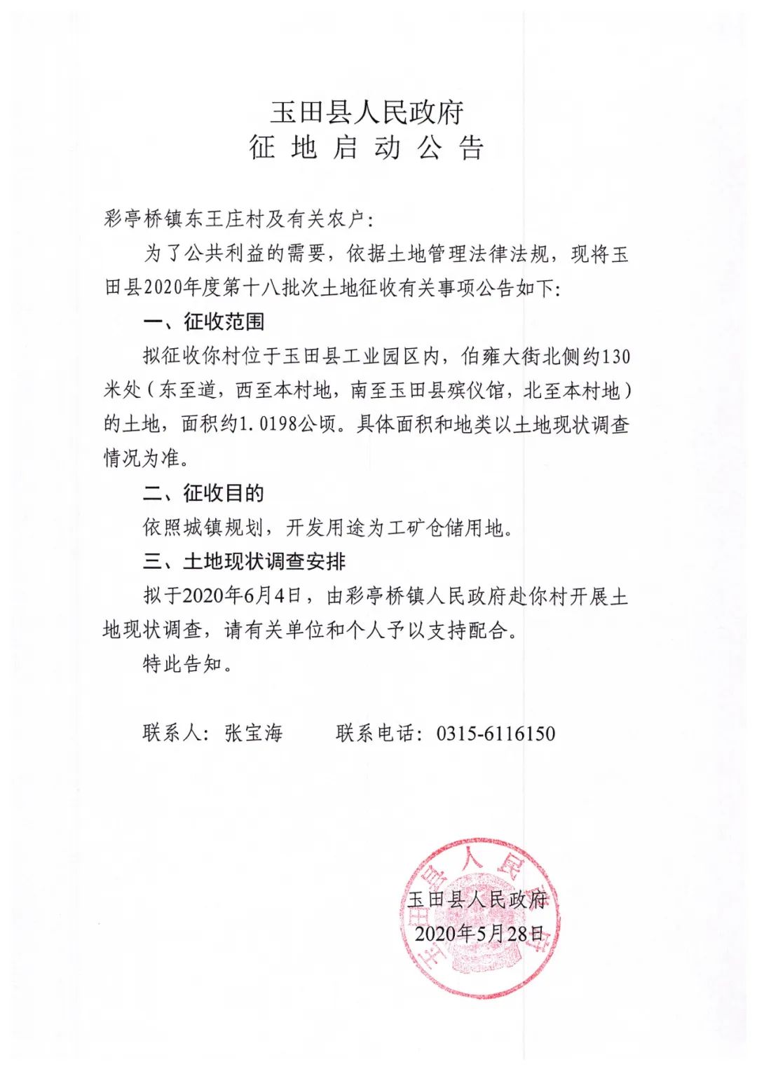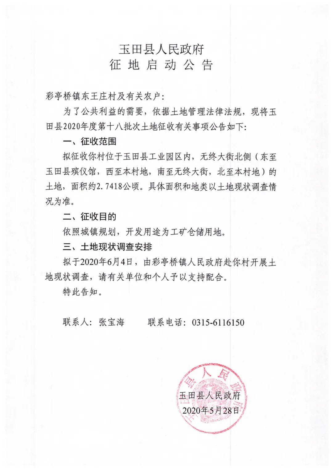 征收范围:位于玉田县工业园区内,玉滨公路南侧(东至本村地,西至东王庄村地,南至东王庄村地,北至道)的土地。