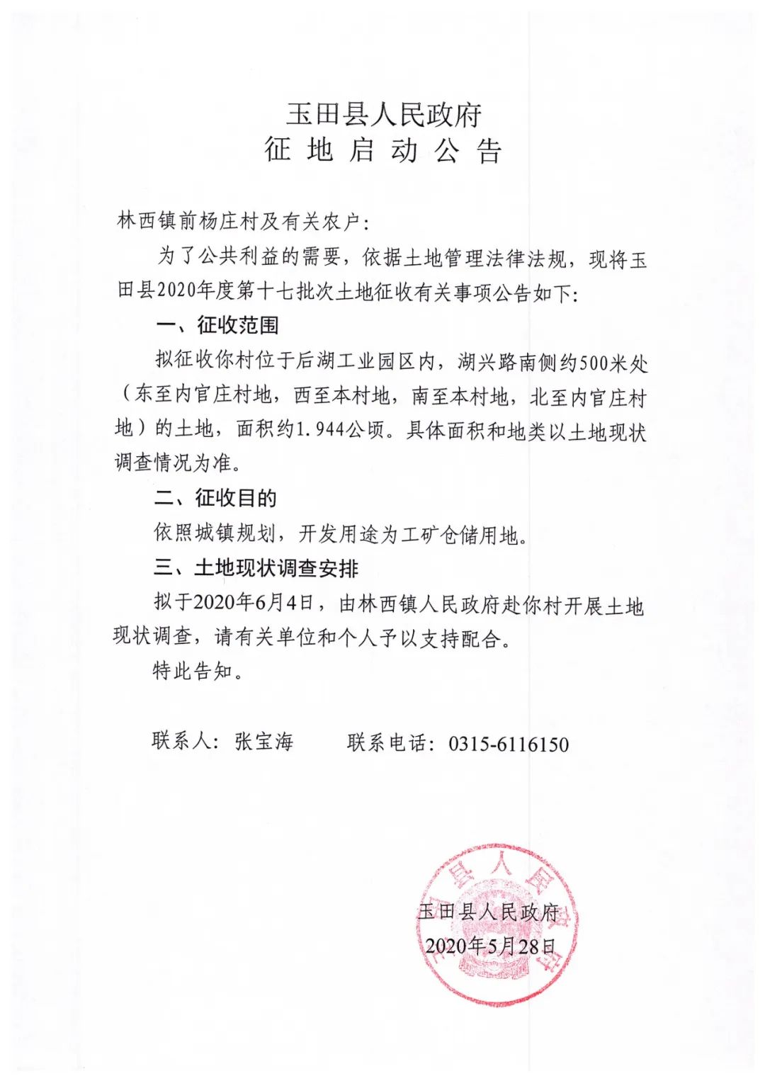 征收范围:位于后湖工业园区内,湖兴路南侧(东至本村地,西至前杨庄村地,南至林西镇内官庄村地,北至前杨庄村地)的土地。