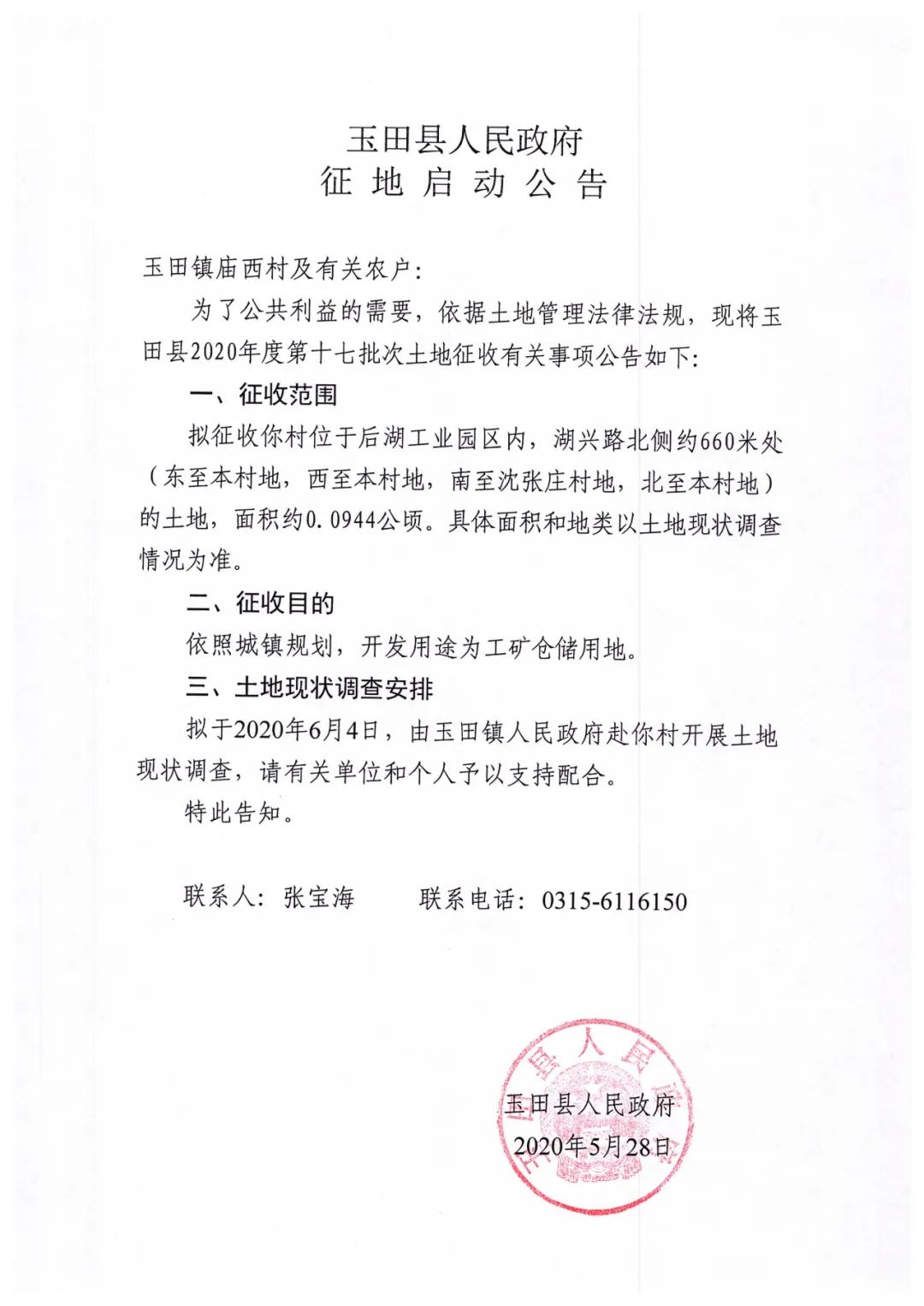 征收范围:位于玉田县工业园区内,西环路西侧约40米处(东至西环路西侧约40米处,西至本村地,南至本村地,北至本村地)的土地。