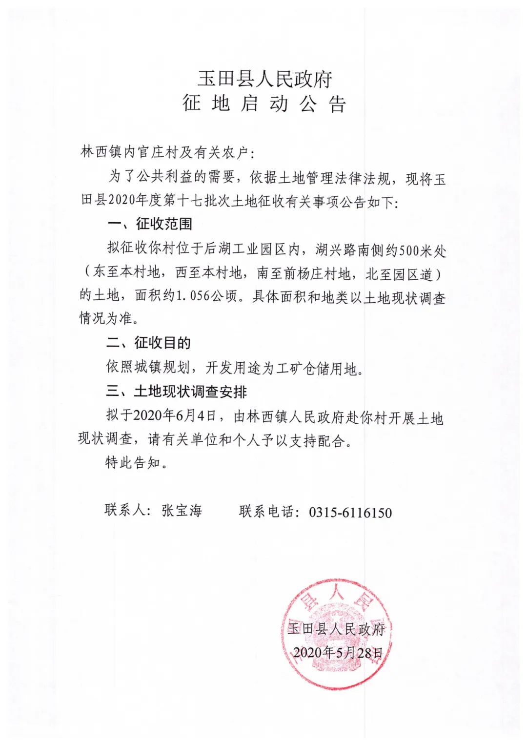 征收范围:位于玉田县工业园区内,玉滨公路南侧(东至本村地,西至本村地,南至唐山东方自来水安装有限公司,北至玉滨公路)的土地。