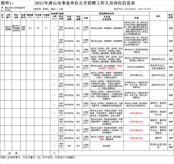 2021年4月12日在唐山人力资源和社会保障局官网事业单位人事管理栏目()、唐山幼儿师范高等专科学校网站()发布招聘信息,包括岗位、人数、条件以及报名、考试安排等。在招聘过程中的重要通知事项,将通过“唐山幼儿师范高等专科学校网站”发布,请应聘人员及时关注。