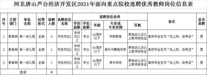 选聘事业编制优秀幼儿教师8名(详见附件《河北唐山芦台经济开发区2021年面向重点院校选聘优秀教师岗位信息表》),各选聘岗位之间可按照报名情况、考试结果适当调剂。