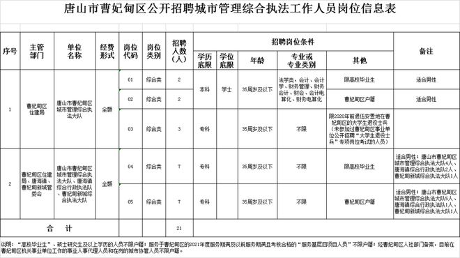 此次公开招聘城市管理综合执法人员21名,岗位条件详见《唐山市曹妃甸区公开招聘城市管理综合执法工作人员岗位信息表》(附件1)。