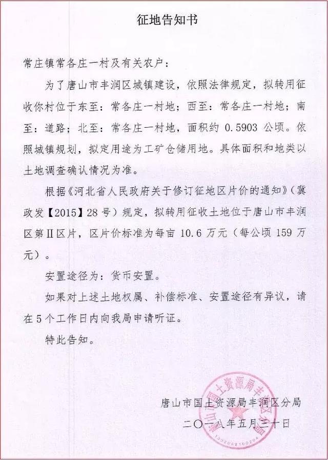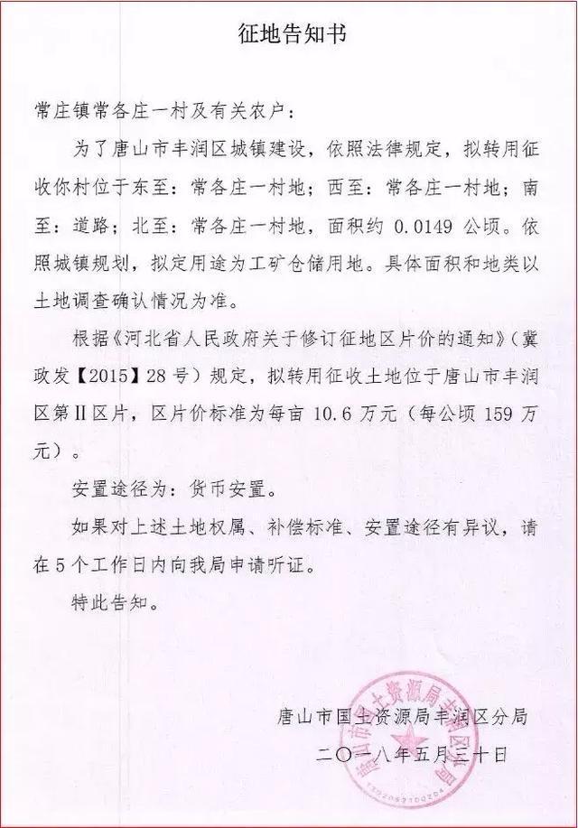 5月30日,丰润区政府网站发布征地告知书,拟征收常庄镇常各庄一村和丰润镇王家楼村的共三块土地,用作工矿仓储用地。