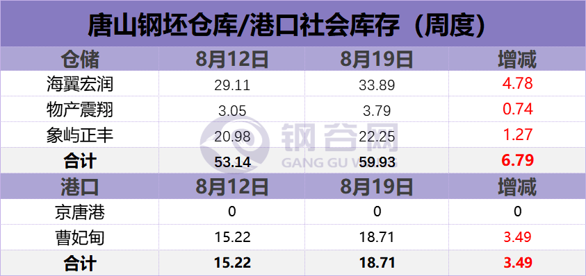港口钢坯库存18.71万吨,占总库存的23.79%,较上周增加3.49万吨,增幅22.93%;其中曹妃甸较上周增加3.49万吨至18.71万吨;京唐港现无钢坯库存。