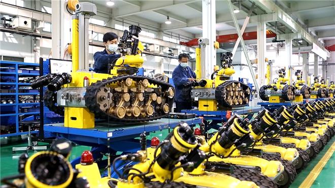 中信重工开诚智能装备有限公司的工人正在消防机器人生产线进行组装。 河北日报通讯员 刘梓涵摄