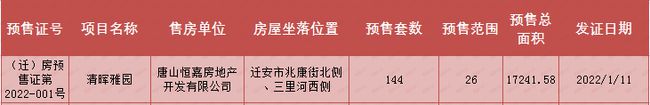 截至1月17日10时,乐居唐山监控上周(2022年1月10日-2022年1月16日)唐山预售市场仅清晖雅园项目获批预售,新增约17241.58平方米。