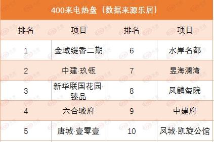 据乐居本站的监测,上周(2022年1月10日-2022年1月16日)400来电环比增涨360%。前10楼盘分别为:金域缇香二期、中建·玖瓴、新华联国花园·臻品、六合骏府、唐城·壹零壹、水岸名都、昱海澜湾、凤麟玺院、中建府、凤城·凯旋公馆。