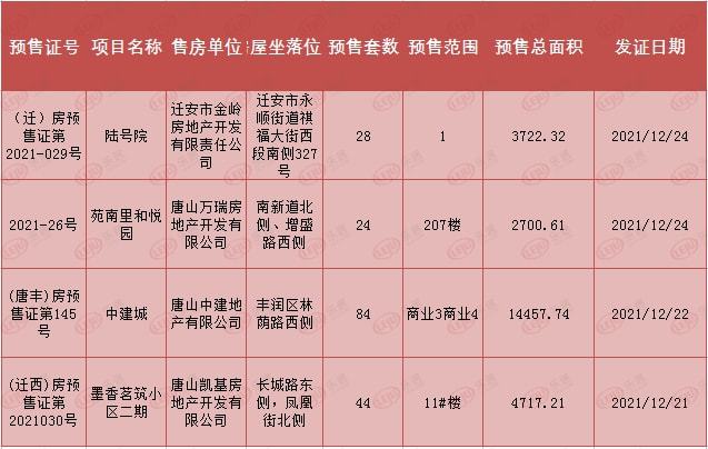 获批预售的项目有4个,分为中建城、墨香茗筑小区二期、陆号院、苑南里和悦园(万科翡翠观唐)。其中获批预售套数最多的项目为丰润的中建城,预售84套。获批预售面积最多的项目同样为中建府,达14457.74平方米。