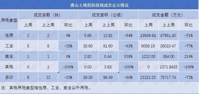 截至1月10日10时,编辑监测中国土地网土地数据,上周(2022年1月3日-2022年1月9日)唐山土地成交8宗,成交面积约39.30 公顷,成交金额约21221.02万元。