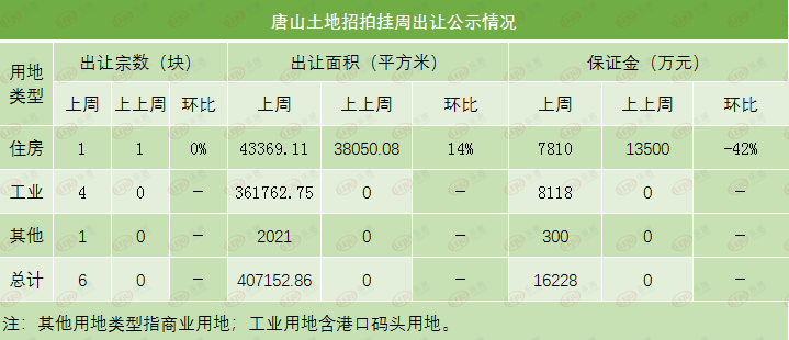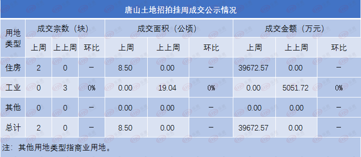 截至编辑截稿,编辑监测中国唐山公布以及中国土地网土地数据,上周(2021年2月8日-2021年2月14日)唐山土地成交2宗地,均为住宅用地并且都出自开平区,共计8.501424公顷,成交金额约为39672.5711万元,拿地房企为唐山中洲房地产开发有限公司。