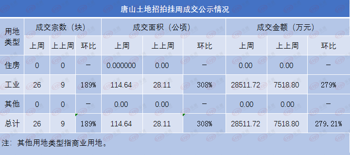 截至7月19日9时编辑截稿,编辑监测中国土地网土地数据,上周(2021年7月12日-2021年7月18日)唐山土地成交26宗地,共计114.64公顷,成交金额约为28511.72万元。