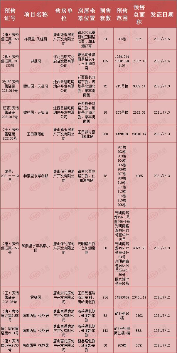 获批预售的项目为祥德里 凤缇苑、御景湾、碧桂园·天玺湾、玉田雍璟府、和泰里水岸名都、雲栖园、南湖西里 悦然居。其中获批预售套数最多的项目为玉田雍璟府,预售288套。获批预售面积最多的项目同样为玉田雍璟府,达29610.47平方米。