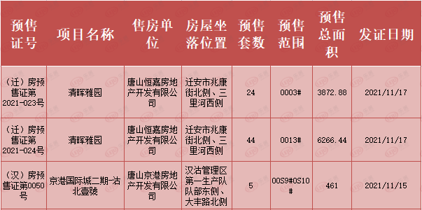获批预售的项目有2个,分为清晖雅园、京港国际城二期-沽北壹號。其中获批预售套数最多的项目为迁安的清晖雅园,预售68套。获批预售面积最多的项目同样为清晖雅园,达10139.32平方米。以上两个项目仅京港国际城二期-沽北壹號有1套网签,具体信息如下: