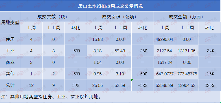 截至11月22日10时,编辑监测中国土地网土地数据,上周(2021年11月15日-2021年11月21日)唐山土地成交12宗,成交面积26.56,成交金额53586.89万元。