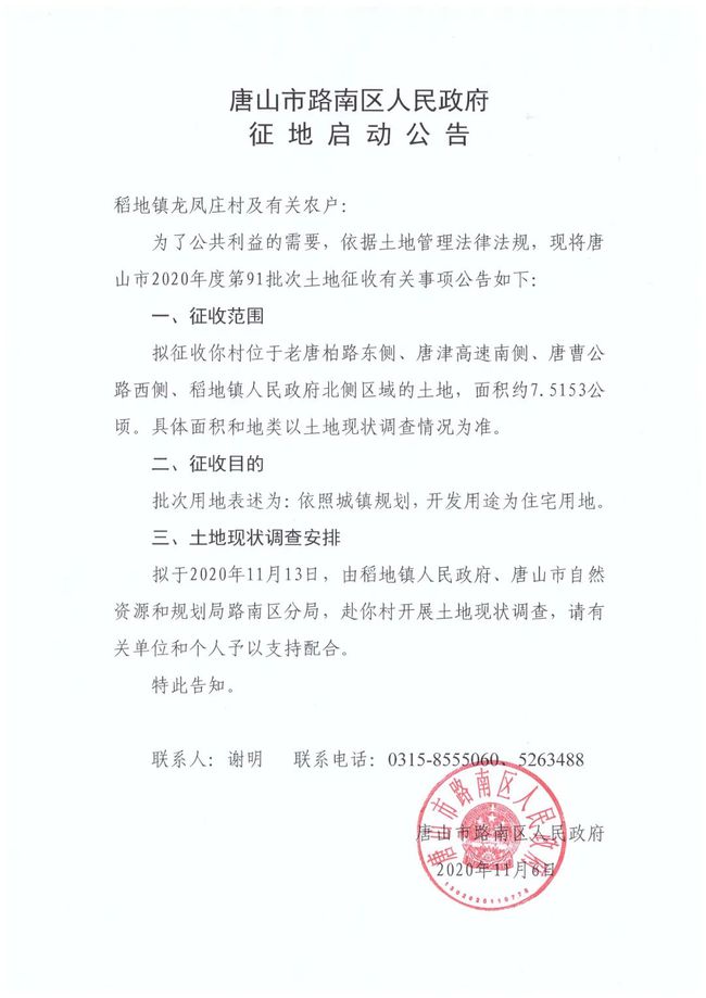 近日,中国唐山网站发布《唐山市2020年第91批次征地启动公告》和《唐山市2020年度第93批次征地启动公告》。公告显示,征地涉及路南区稻地镇龙凤庄村、安机寨前街村、安机寨中街村。详情如下: