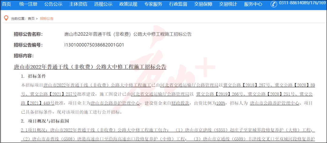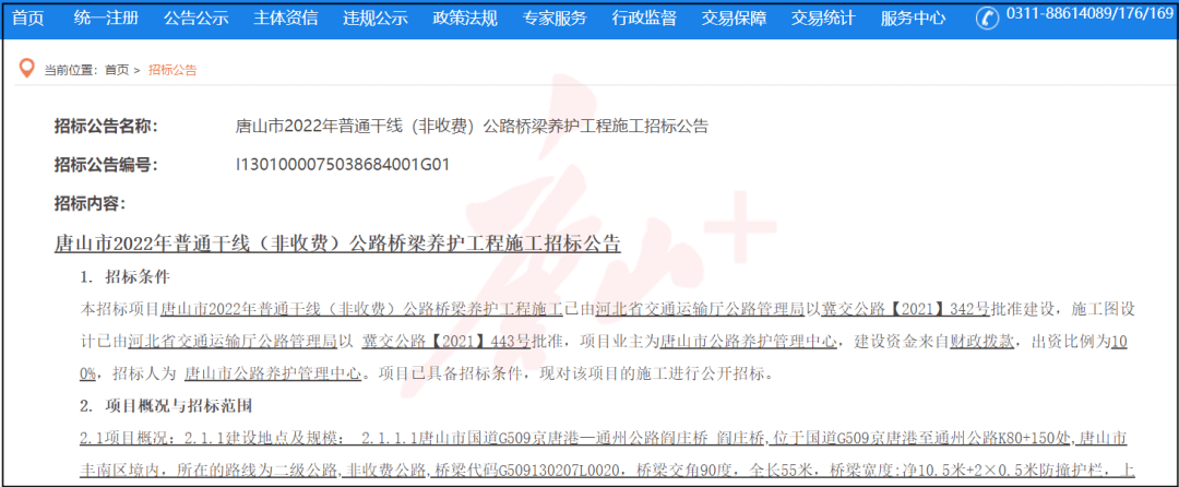 近日,中国河北网站发布《唐山市2022年普通干线(非收费)公路大中修工程施工招标公告》《唐山市2022年普通干线(非收费)公路桥梁养护工程施工招标公告》,详情如下: